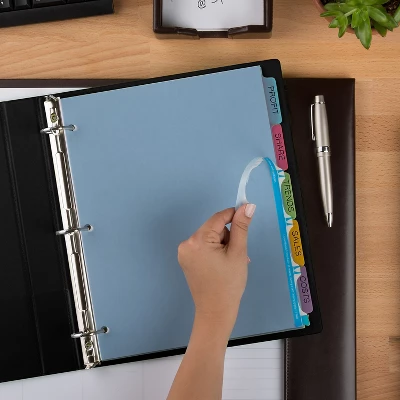 Categorize binder contents by color and subject with these Avery Index Maker clear five-tab multicolor label dividers. Don’t waste time and money ordering custom printed binder dividers with tabs when you can easily create and print your own personalized dividers with Avery Index Maker Clear Label Dividers. Customize your title tabs quickly and easily using the free templates on the Avery website and print with your inkjet or laser printer for clean, professional looking results in minutes. This pack comes with one set of 5-tab dividers, and the Easy Apply clear label strips make it simple to apply all 5 labels at once. Just print, align labels against tabs, smooth down labels and peel up strip. The white binder dividers feature an assortment of colored tabs for eye-catching convenience when you’re looking for the right section. Each 3-hole punched durable divider is tear resistant and provides extra strength for long-lasting, everyday use. These 3 ring binder dividers with tabs are a great addition to your medical office supplies, school binders, personal organizers, tax office supplies, presentation reports and more. Print, peel, and press your way to a perfect, precise project. Durable multicolor plastic tabbed dividers are made from tear resistant material durable enough to endure frequent use. Save time and money by creating your own high-quality custom tab dividers using free templates from the Avery website and printing on your laser or inkjet printer. Label all 5 tab dividers at once with the Index Maker Easy Apply Label strip that results in one perfectly aligned set of tabs. Get a professional, printed-on look with clear labels that virtually disappear on the multicolored divider tabs. Great for organizing your medical document binder, meeting materials, proposals, tax organizer binder, financial planner and more. Tab dividers let you organize projects, personal documents, and more. Clear label translucent multicolor tab divide..