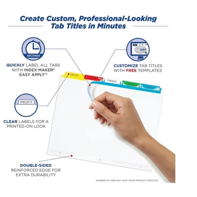 Subdivide file folders with these Avery Index Maker 12-tab clear-label multicolor dividers. Easily create print shop quality personalized binder dividers with tabs using Avery Index Maker Clear Label Dividers. Customize the title tabs for your dividers quickly and easily using the free templates on the Avery website and print with your inkjet or laser printer for clean, professional looking results in minutes. This pack comes with 5 sets of 12-tab dividers, and the Easy Apply clear label strips make it simple to apply all 12 labels of each set at once. Just print, align labels against tabs, smooth down labels and peel up strip. The white binder dividers feature an assortment of brightly colored tabs for eye-catching convenience when you’re looking for the right section. Each 3-hole punched durable divider also features doubled-sided, reinforced tabs and edges to help resist tearing for long-lasting, everyday use. These 3 ring binder dividers with tabs are a great addition to your medical office supplies, school binders, personal organizers, tax office supplies, presentation reports and more. Print, peel, and press your way to a perfect, precise project. Find binder sections easily with white tabbed dividers featuring brightly colored tabs perfect for color coding and quick referencing. Save time and money by creating your own high-quality custom tab dividers using free templates from the Avery website and printing on your laser or inkjet printer. Label all 12 tab dividers at once with the Index Maker Easy Apply Label strip that results in five perfectly aligned sets of tabs. Get a professional, printed-on look with clear labels that virtually disappear on the multicolor divider tabs. Great for organizing your medical document binder, meeting materials, proposals, tax organizer binder, financial planner and more. Tab dividers let you organize projects, personal documents, and more. Clear label multicolor tab dividers are made of white pap..
