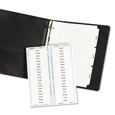 - Get a professional, printed-on look with clear labels that virtually disappear on the white divider tabs. White color for an attractive look. Easy Apply strips let you label all the tabs at once. They are sold as five per pack.