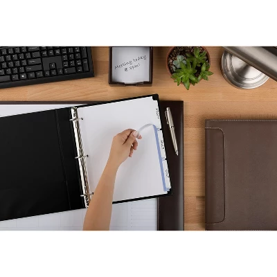Enjoy the convenience of easy label application with this 5-pack of Avery Index Maker white three-tab clear-label dividers. Easily create print shop quality personalized binder dividers with tabs using Avery Index Maker Clear Label Dividers. Customize the title tabs for your dividers quickly and easily using the free templates on the Avery website and print with your inkjet or laser printer for clean, professional looking results in minutes. This pack comes with five sets of 3-tab dividers, and the Easy Apply clear label strips make it simple to apply all 3 labels of each set at once. Just print, align labels against tabs, smooth down labels and peel up strip. Each 3-hole punched durable divider also features doubled-sided, reinforced tabs and edges to help resist tearing for long-lasting, everyday use. These 3 ring binder dividers with tabs are a great addition to your medical office supplies, school binders, personal organizers, tax office supplies, presentation reports and more. Print, peel, and press your way to a perfect, precise project. Save time and money by creating your own high-quality custom tab dividers using free templates from the Avery website and printing on your laser or inkjet printer. Label all 3 tab dividers at once with the Index Maker Easy Apply Label strip that results in five perfectly aligned sets of tabs. Get a professional, printed-on look with clear labels that virtually disappear on the white divider tabs. Great for organizing your medical document binder, meeting materials, proposals, tax organizer binder, financial planner and more. Long-lasting, tear-resistant tabbed dividers feature doubled-sided reinforced tabs and edges. Tab dividers let you organize projects, personal documents, and more. White color for an attractive look. Dimensions: 8.5″W x 11″L. Ideal for creating professional dividers in minutes with your laser or inkjet printer. Great for project binders meeting materials manuals traini..