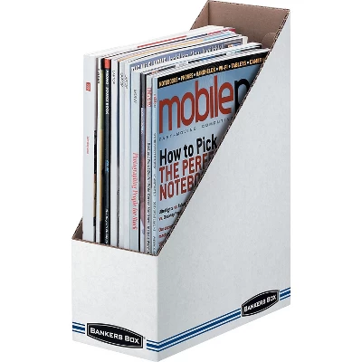 BANKERS BOX STOR/FILE Magazine File, Letter, White/Blue, 11 3/4″H x 4″W x 9 1/4″D, 12/Ct. Sturdy white corrugated construction for moderate usage. Holds standard letter size materials. Ideal for use on desk or shelf. 50% post-consumer content. Label area on all sides. 12 files per carton. Shipped flat. Package Includes: Includes 12 magazine files. Color(s): White/Blue. Material(s): Corrugated Cardboard. Product Type Refinement: Magazine. Sold as 12/Carton.