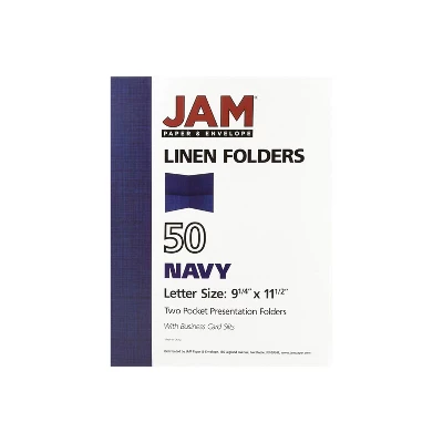 JAM Paper Folders are great for storing, transporting, and organizing all of your documents and notes! JAM Paper Navy Blue Linen Two Pocket Presentation Folders are made out of durable 100lb cardstock. These folders feature a sophisticated dark blue color and a refines linen fish, a combination which gives these folders an elegant and professional appearance in both work and academic settings. These folders are sold in pack of 50. Each one has two pockets on the inside along with a convenient business card slot on the left-side pocket. At 9 x 12 inches in size, these folders are ideal for standard sized sheets of paper. Use them to organize, carry, and store all of your important papers and notes. Two Pocket Folder. Made with sturdy navy blue linen cardstock. 9″” x 12″”. Safety Data Sheet. Sold as 50/Box.