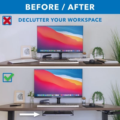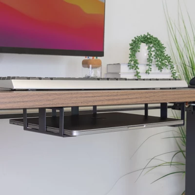 The under desk laptop mount is an excellent solution to free up valuable desktop space, especially for those who work with limited space for their office equipment. The mount can accommodate a wide range of devices, including laptops, tablets, modems, cable boxes, and small game consoles up to 1.5″ high. The mount’s foam pads ensure that your device is protected from scratches while in use. With its sleek yet sturdy design it can also be mounted under shelves or vertically on the wall. The mount comes with screws and padding, for precise and secure mounting, making it an easy DIY installation for anyone. By using this under desk laptop holder, you can keep your workspace clean and organized while enjoying more desk space.