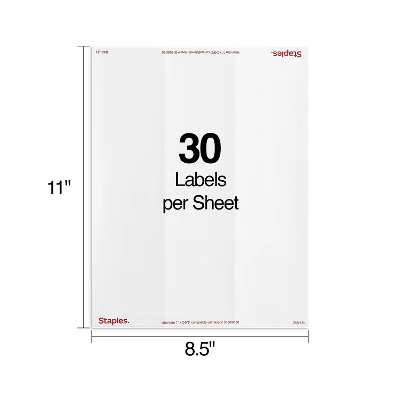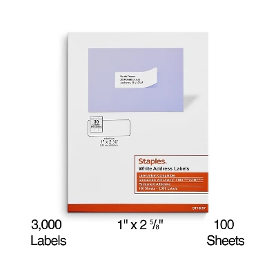 Ship envelopes and packages with a professional look by using this 3,000 pack of 1 x 2 5/8-inch white inkjet/laser address labels. Send mail with confidence by using these white address labels. These labels can be customized with designs created in common word processing programs and printed on using laser and inkjet printers. These address labels stick permanently to packages and envelopes, so you don’t have to worry about them peeling off while in transit. These address labels make your most important messages stand out. Individual labels measure 1H x 2 5/8W. White color for an attractive look. Features a permanent adhesive backing for a secure bond. 30 labels per sheet, 100 sheets per pack; 3000 total labels. Compatible with laser and inkjet printers for maximum flexibility. Perforated Sheets. Click here for product instructionsClick here to download the template. These address labels make your most important messages stand out. Individual labels measure 1″H x 2 5/8″W. White color for an attractive look Features a permanent adhesive backing for a secure bond. 30 labels per sheet, 100 sheets per pack; 3000 total labels Compatible with laser and inkjet printers for maximum flexibility Perforated Sheets Click here for product instructionsClick here to download the template . Sold as 3000/Box.