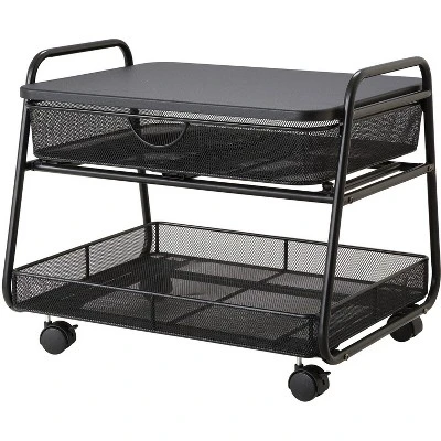 Slides easily under desk or work surface when not in use to save space. Mobile under desk machine or printer stand. Mobile cart on four swivel casters, two locking. Black powder coat steel. Long-lasting durability. Steel wire frame and shelf with mesh baskets for storage of printers, fax machines, files or other supplies. Sold as 1 Each.