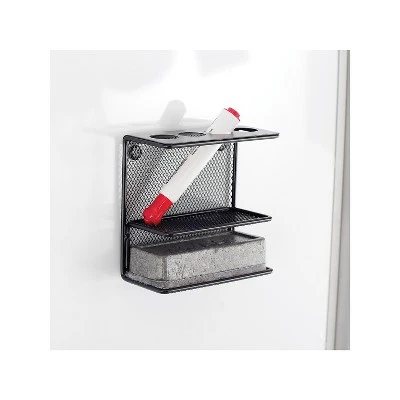 Make presentations easier with this Safco Onyx mesh marker holder. Organize your whiteboard accessories using this marker caddy. The magnetic attachment sticks to metal surfaces, or use the included steel plate to mount your Onyx marker holder to the wall. Four stand-up slots keep markers handy at all times while the lower shelf is ideal for holding an eraser. Sturdy steel wire-mesh construction and a powder-coat finish ensure durability. Accessories holder lets you store board accessories. Black steel wire-mesh accessories holder. Dimensions: 5.25″”H x 5.25″”W x 2.5″”D. Magnetic back allows for use on whiteboard or any other magnetic surface. Includes four stand-up marker holders that fit most standard whiteboard dry-erase markers. Sold as 1 Each.