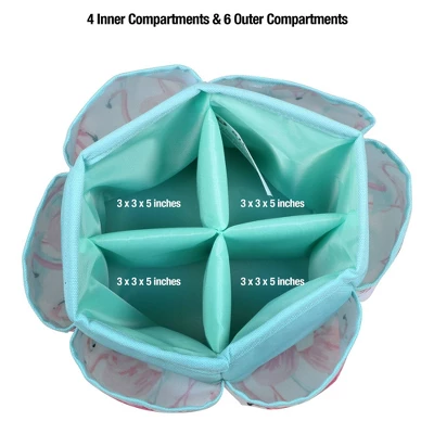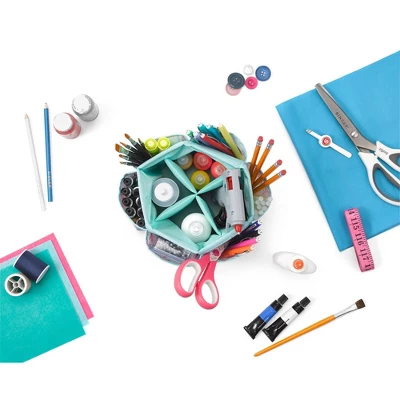 The SINGER Tabletop Sewing Storage Spinner in Pastel Flamingo Print is an ideal sewing organizer for durable, easy-to-access storage space. This spinning sewing organizer can be placed on a sewing machine console, desk, counter, table, or any flat surface to organize an assortment of sewing supplies, accessories, and tools. The spinner is covered in a high-quality polyester fabric that is stylish and easy to clean, and its rotating base makes it easy to turn so that you can pick out whatever tool or accessory you need. The organizer is evenly divided into four spacious and padded inner compartments that can be used to securely organize everything from thread spools, needles, and pins to seam rippers, pincushions, and needle threaders. In addition to all the interior space, six open outer pockets offer even more storage space and keep sewing supplies such as buttons, thimbles, and small sewing tools neat and organized.