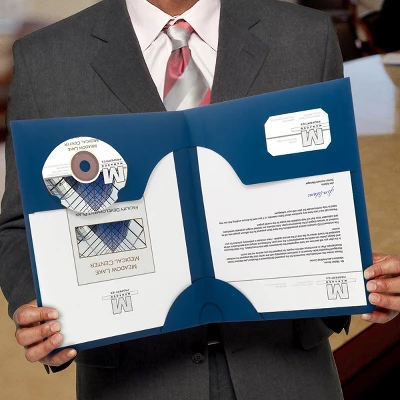- Features two pockets to store papers, brochures, and more. A business card holder adds an extra professional touch to each folder. This product is manufactured by a certified WBE (women owned business).