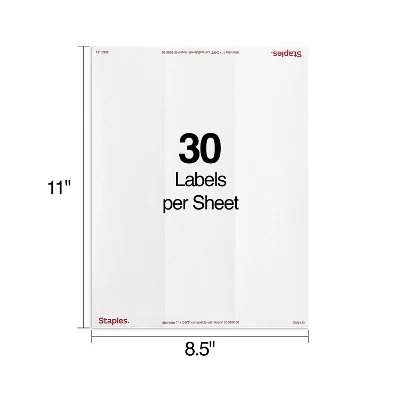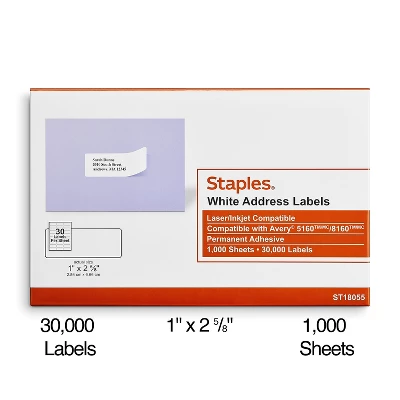 Give bulk mailings a professional appearance with these Staples white multipurpose address labels. Prep envelopes for clients, customers and employees with these Staples multipurpose address labels. Permanent adhesive backings keep each label firmly in place, and the rectangular size offers ample room for complete names and addresses. These labels work with most word processing programs, making them easy to format. With their versatile design, these Staples multipurpose address labels are compatible with both inkjet and laser printers. These address labels make your most important messages stand out. Individual labels measure 1″H x 2 5/8″W. White color for an attractive look. Has a permanent adhesive backing for a secure and easy bond. 30 labels per sheet, 1000 sheets per pack; 30000 total labels. Compatible with laser and inkjet printers for maximum flexibility. Perforated Sheets. Perforated. Sold as 30000/Box.