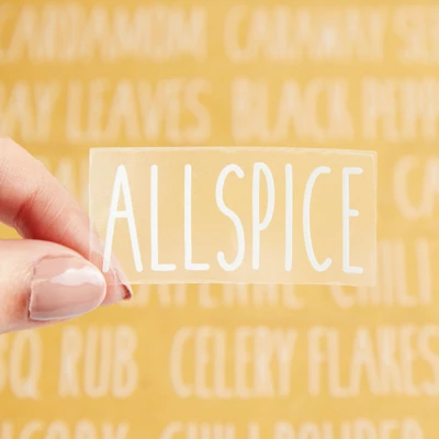 - Spice Jar Labels Preprinted: Create a picture-perfect, organized kitchen or pantry with this set of 145 clear spice labels stickers that includes 132 commonly used herbs