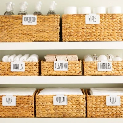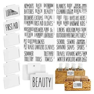 - Preprinted Basket Labels for Storage Bins: Use this set of 70 household stickers and 8 white clip on label holders for storage bins, cubes, and containers in your office, craft room, linen closet, or bathroom