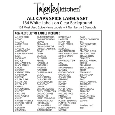 Organize your kitchen drawers, cabinets, and pantry shelves with this set of 134 water-resistant vinyl spice bottle labels. This custom labels for spice jars kit has 7 sheets of 134 herb labels altogether. This set includes 124 preprinted spice labels stickers, 7 number decals, and 3 ampersand (“&”) stickers. The 0.5-inch tall all-caps white text is set against a transparent background; the spice labels vary in length and fit round or square containers. Our seasoning stickers feature the most commonly used spices and herbs, including cayenne, chili powder, turmeric, pepper flakes, rosemary, black pepper, coriander, curry, seasoned salt, lemon pepper, nutmeg, salt, onion powder, cardamon, garlic powder, basil, thyme, ginger, oregano, and smoked paprika. The numbered labels and ampersands allow you to create a kitchen storage solution that fits your needs down to the last jar. You will also receive an alphabetized list of the label names for easy reference. NOTE: Spice jars are not included. Talented Kitchen™ is a trademark or registered trademark of Juvo Plus, Inc. All other marks shown are owned by their respective owners.